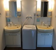 使い捨て歯ブラシとコップを備えた洗面台を2台完備しています 洗剤もご用意していますので洗濯機も自由にご利用ください |